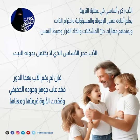 ✍️ الأب ركن أساسي في عملية التربية يعلّم أبناءه معنى الرجولة والمسؤولية واحترام الذات ويمنحهم مهارات حلّ المشكلات واتخاذ القرار وضبط النفس الأب حجر الأساس الذي لا يكتمل بدونه البيت فإن لم يقم الأب بهذا الدور فقد غاب جوهر وجوده الحقيقي وفقدت الأبوة قيمتها ومعناها