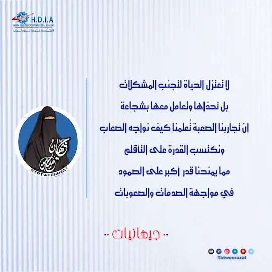 | المحتوى | لا تعتزل الحياة لتجنب المشكلات بل تحدّاها وتعامل معها بشجاعة إن تجاربنا الصعبة تُعلمنا كيف نواجه الصعاب ونكتسب القدرة على التأقلم مما يمنحنا قدر أكبر على الصمود في مواجهة الصدمات والصعوبات.